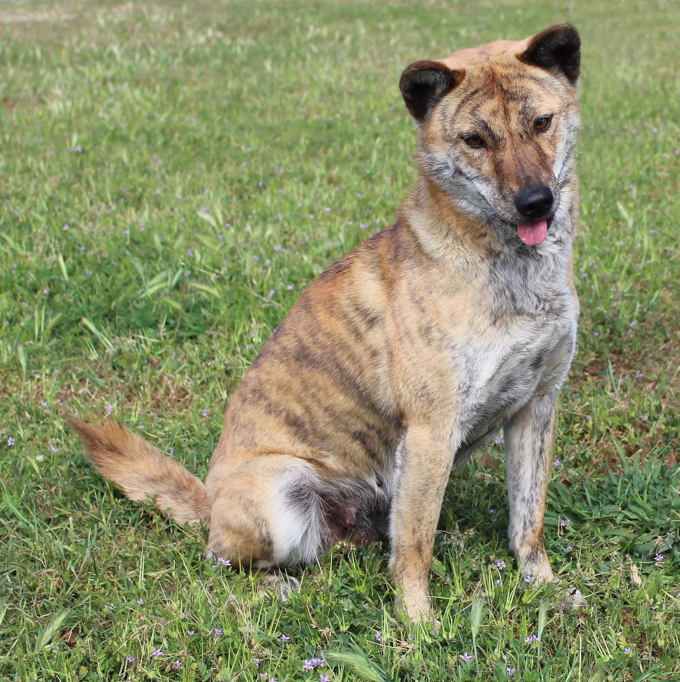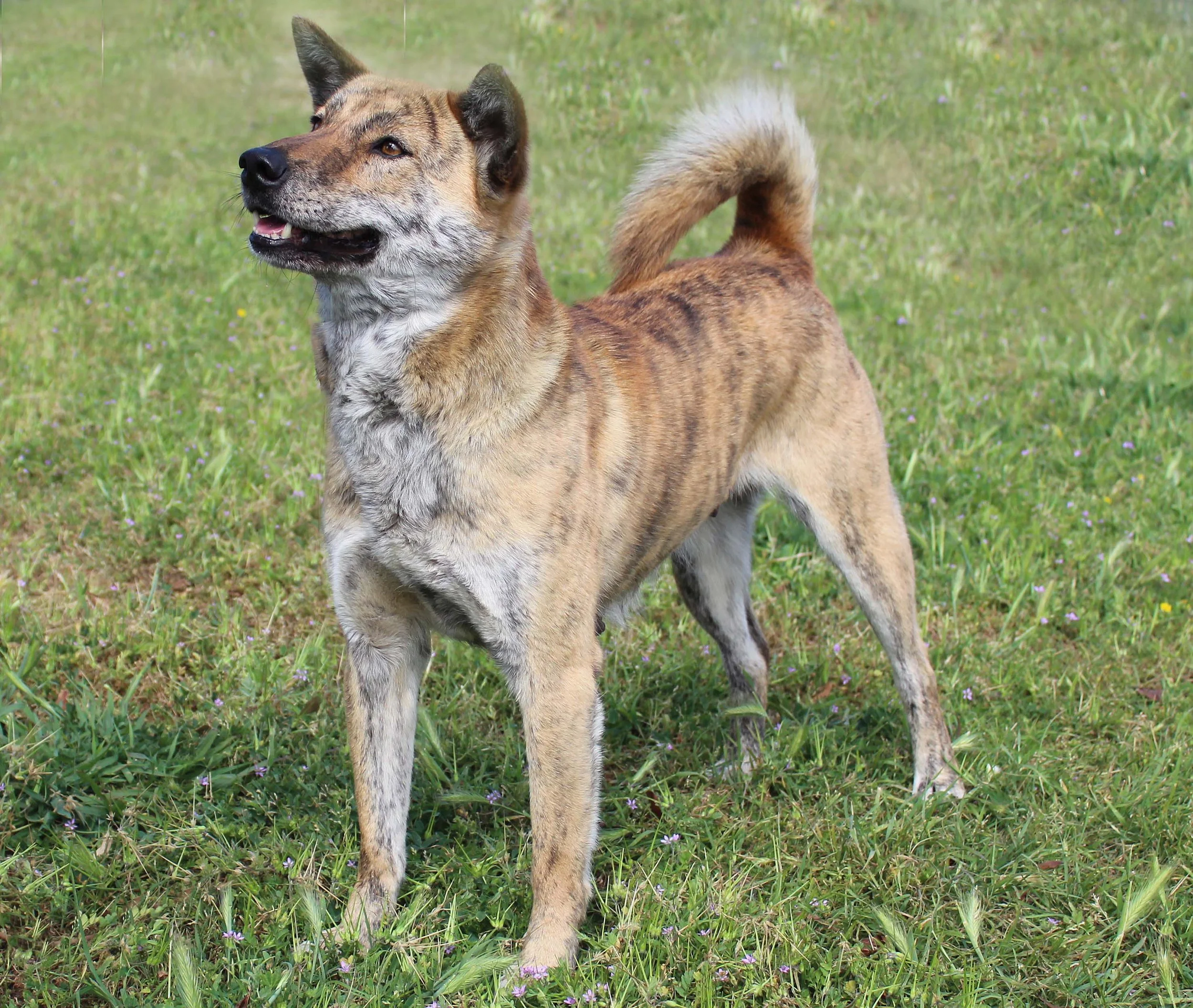 My all time favorite color, I wanted a Brindle Jindo as soon as I knew the breed came in this color. When the opportunity presented itself it did so in a little dog who far exceeded every expectation. HoSu is outgoing with a fearless personality and the kind of confident stable temperament with people and other dogs that I love. Friendly and loving to people, but guardy given reason for suspicion. She avidly hunts and retrieves vermin on the property.